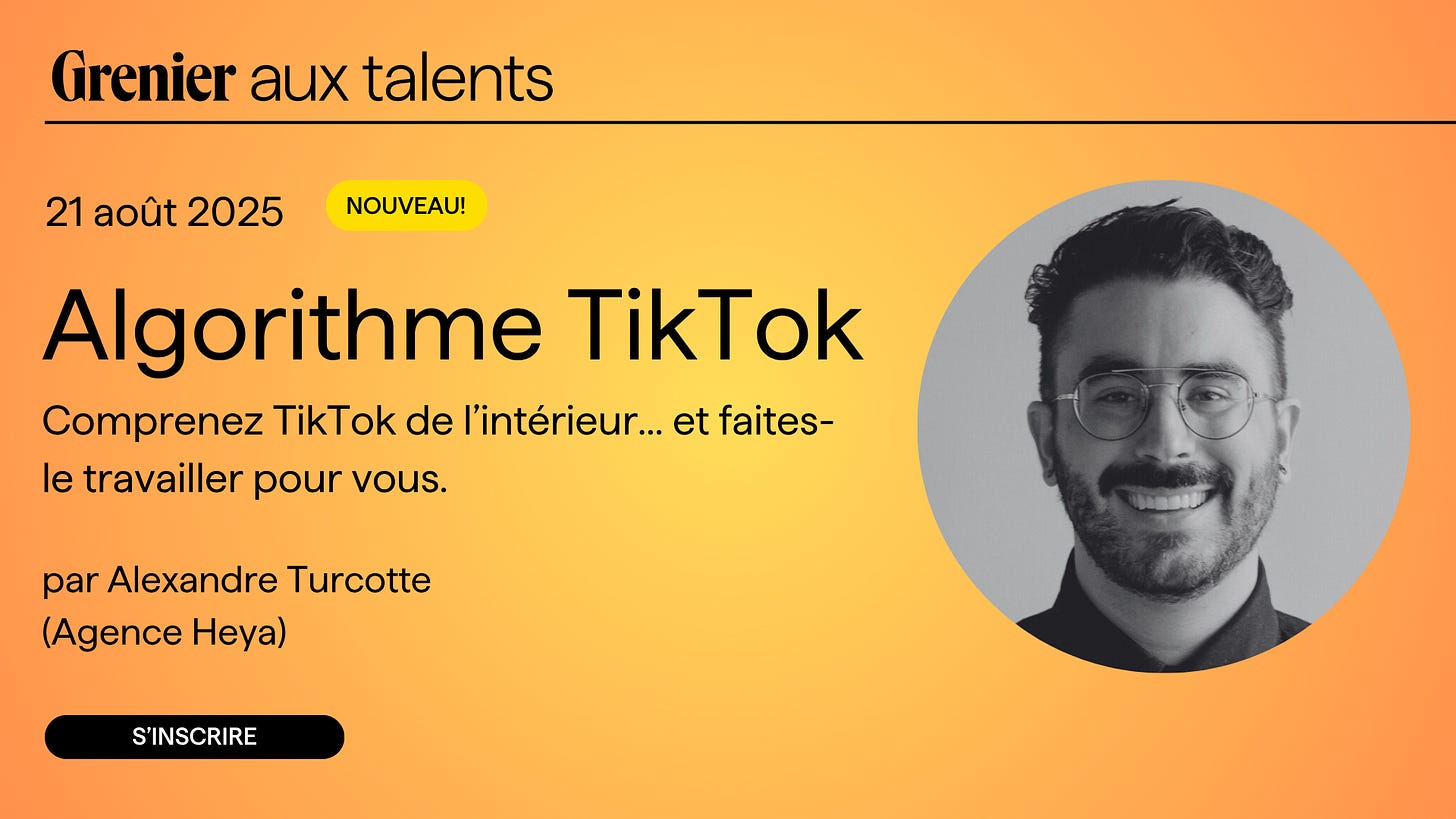 Je serai en ligne avec le Grenier le 21 août prochain pour la formation Algorithme TikTok : Comprendre TikTok de l’intérieur. Achetez votre billet dès maintenant, pendant qu’il en reste! 🤓